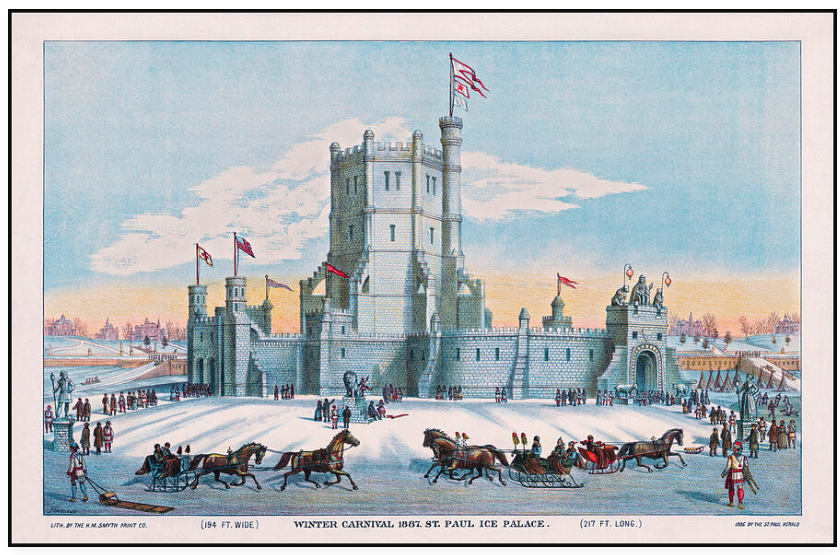 A Group of Business Owners Decided to Retaliate by Creating a Wintertime Festival. This event would showcase all the beauty that Minnesota winters offered. They worked with the City of Montreal which already had a winter carnival in place. Due to a smallpox epidemic which suspended the 1886 Montreal Festival, Saint Paul lured Alexander Hutchinson, the designer of Montreal’s ice palaces in 1883, 1884, and 1885 to blueprint Saint Paul’s first ice castle. The castle was constructed on February 1, 1886 at a cost of $5,210 with a height of 106 feet. A comparison to this first castle is the Pepsi Palace of 1992 with a cost of $1,900,000 and a height of 165 feet (a Guinness record).